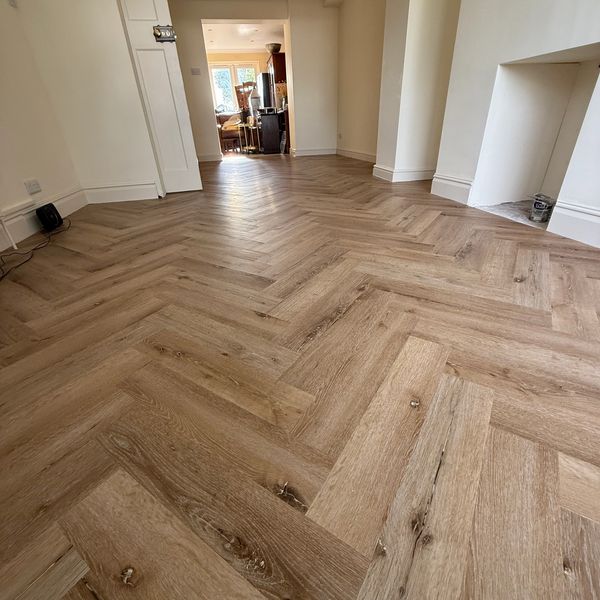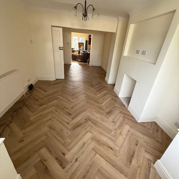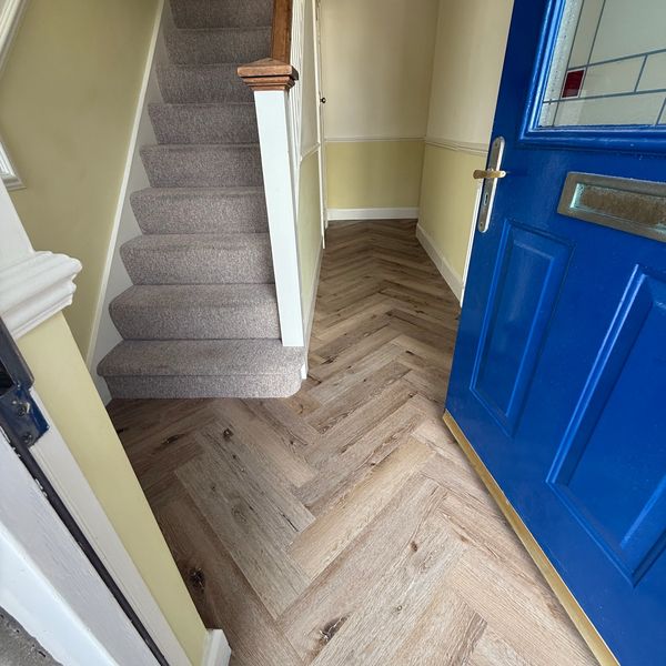 At D E Floors Ltd, we recently completed the supply and installation of luxury vinyl tile (LVT) flooring in a domestic property located in Shepton Mallet. The client chose the beautiful ‘Woodland Fir’ LVT, which we installed in a herringbone pattern, completely transforming the look and feel of the ground floor and creating a modern, elegant interior.